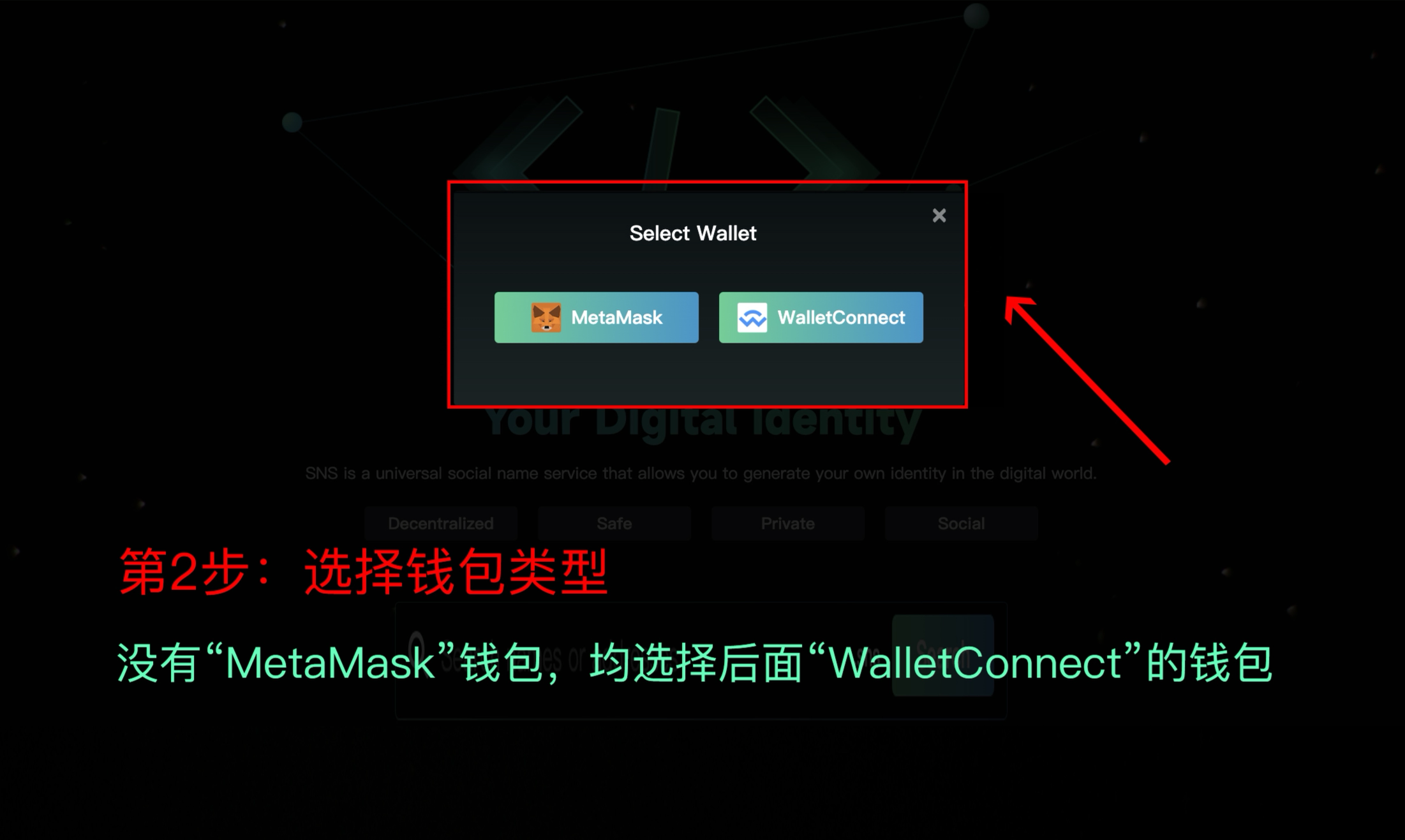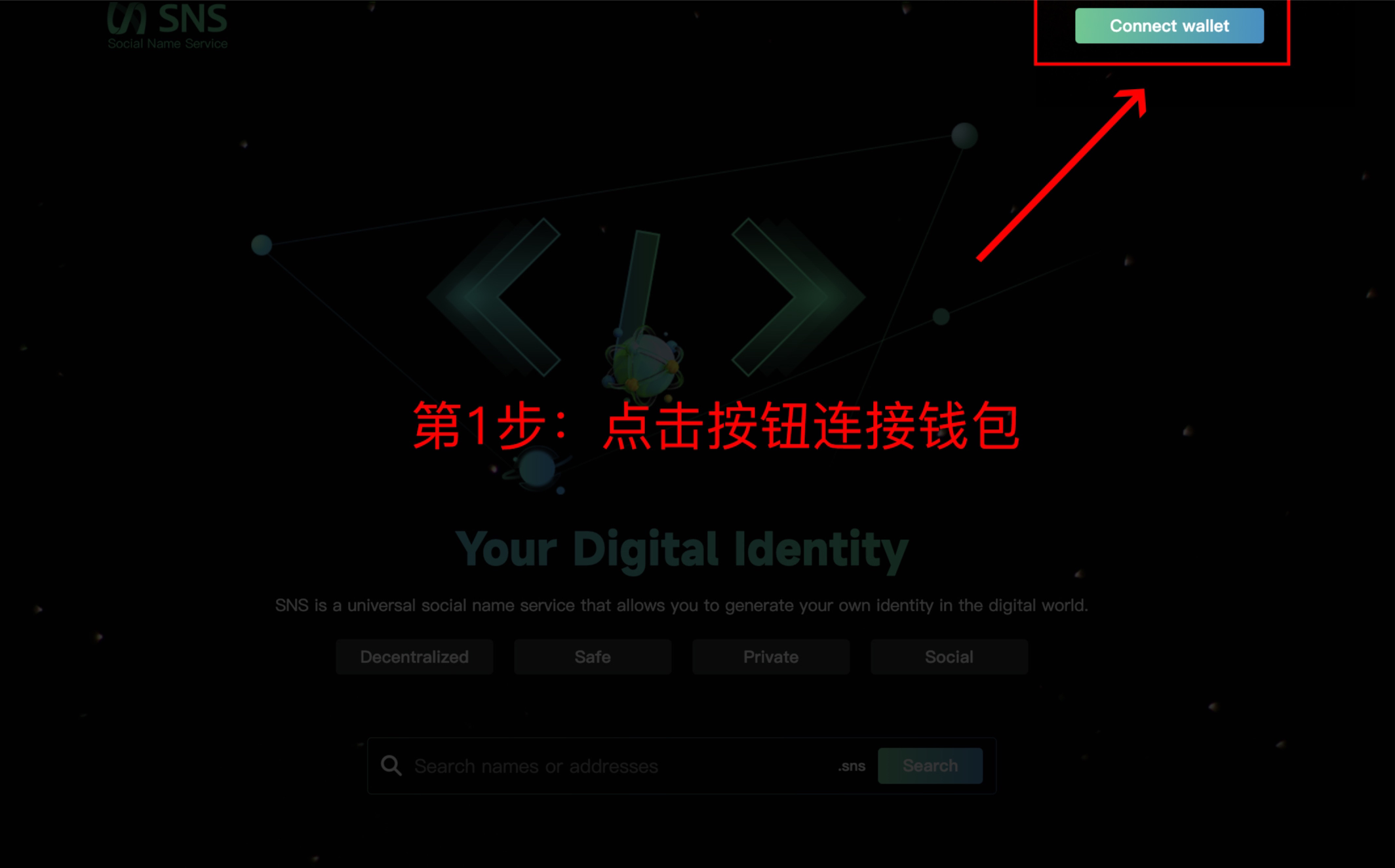 1. 点击官网 https://sns.finance/ 首页右上角的“Connect Wallet”。