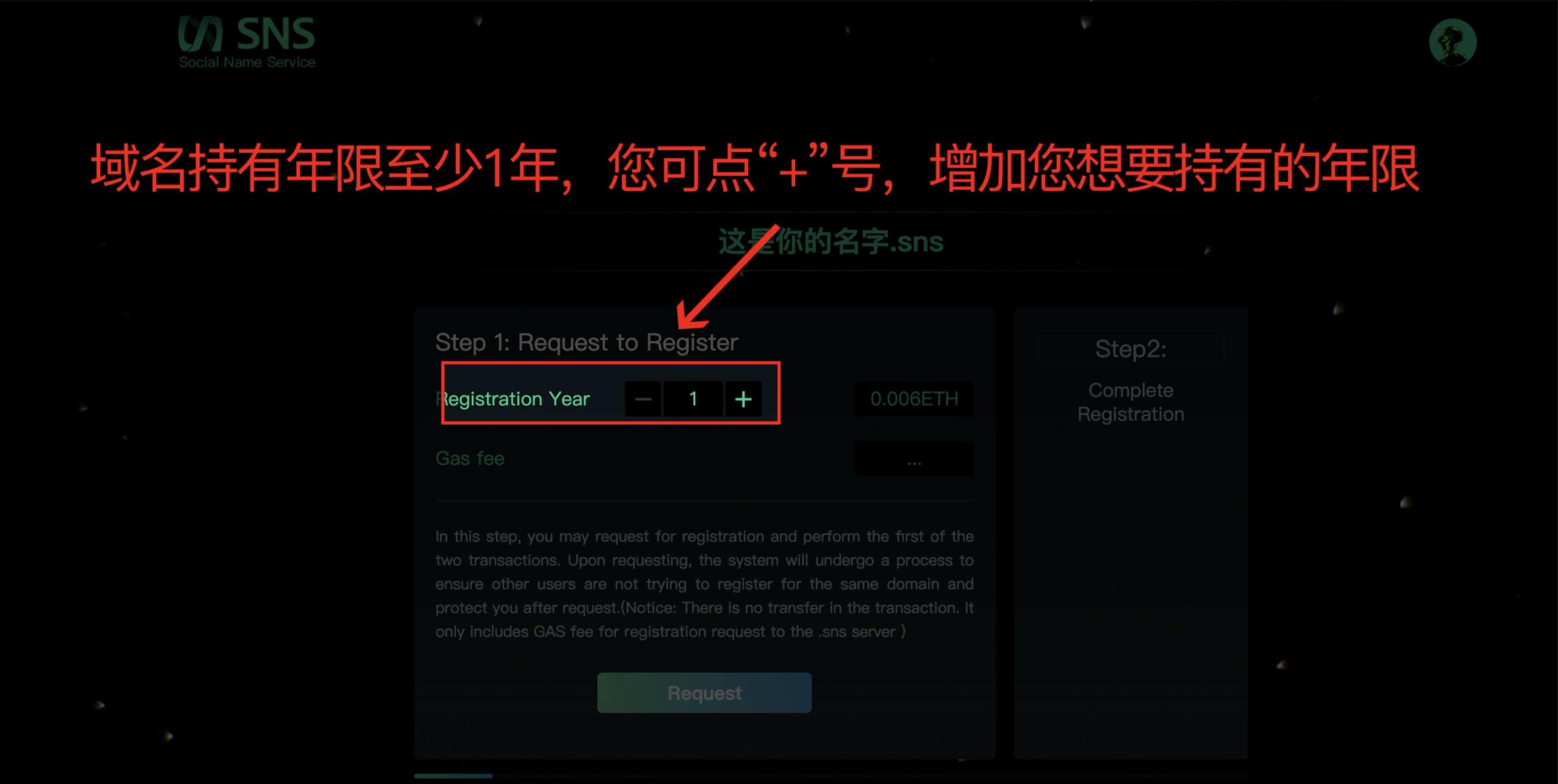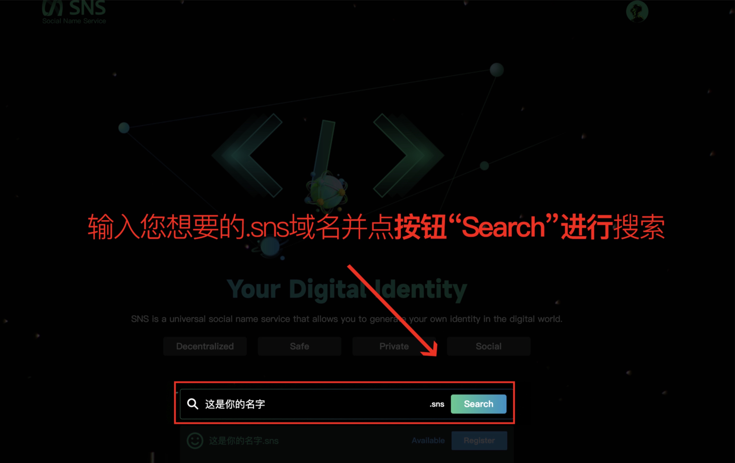 1. 输入域名:输入您想要的.sns域名