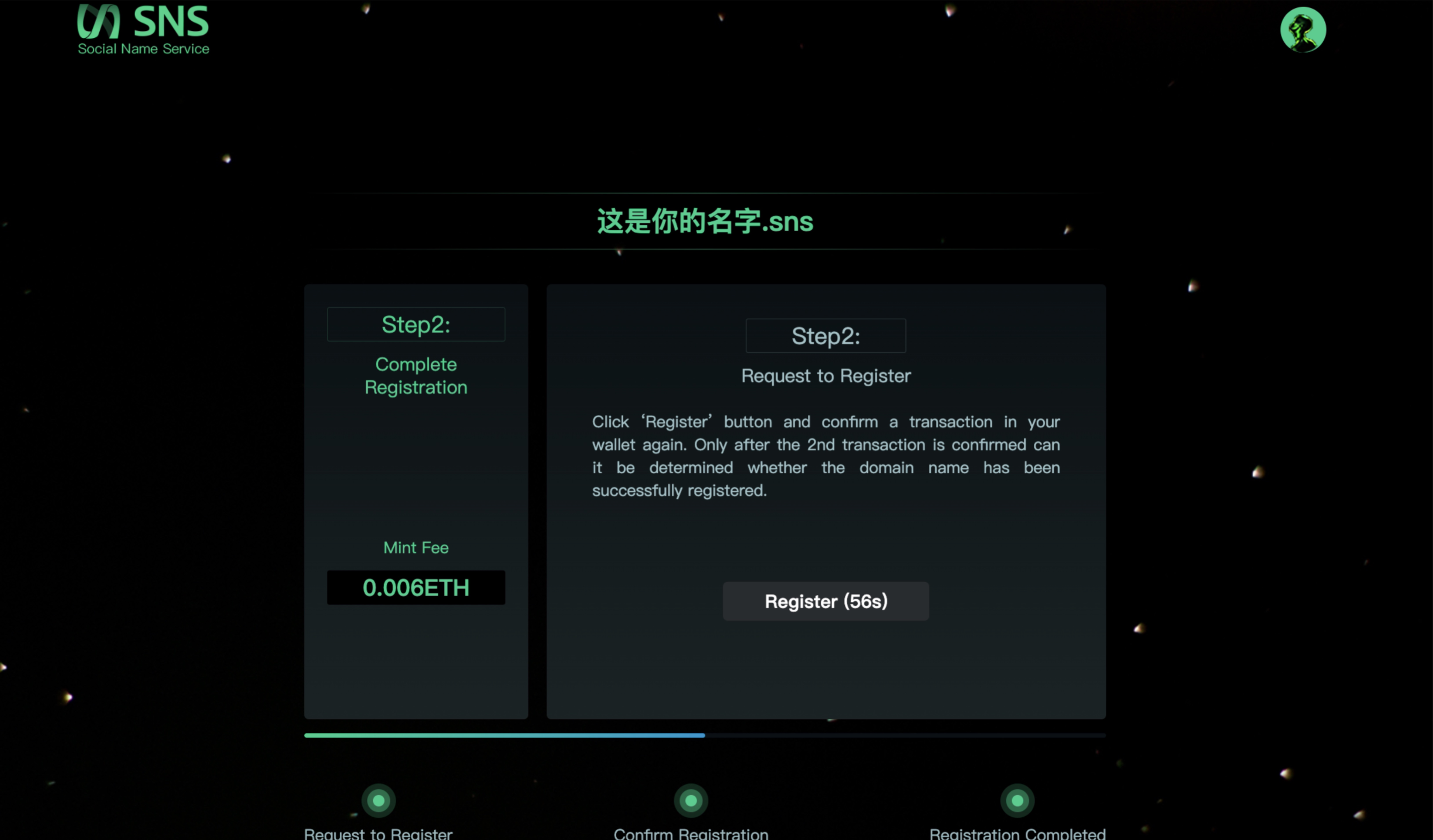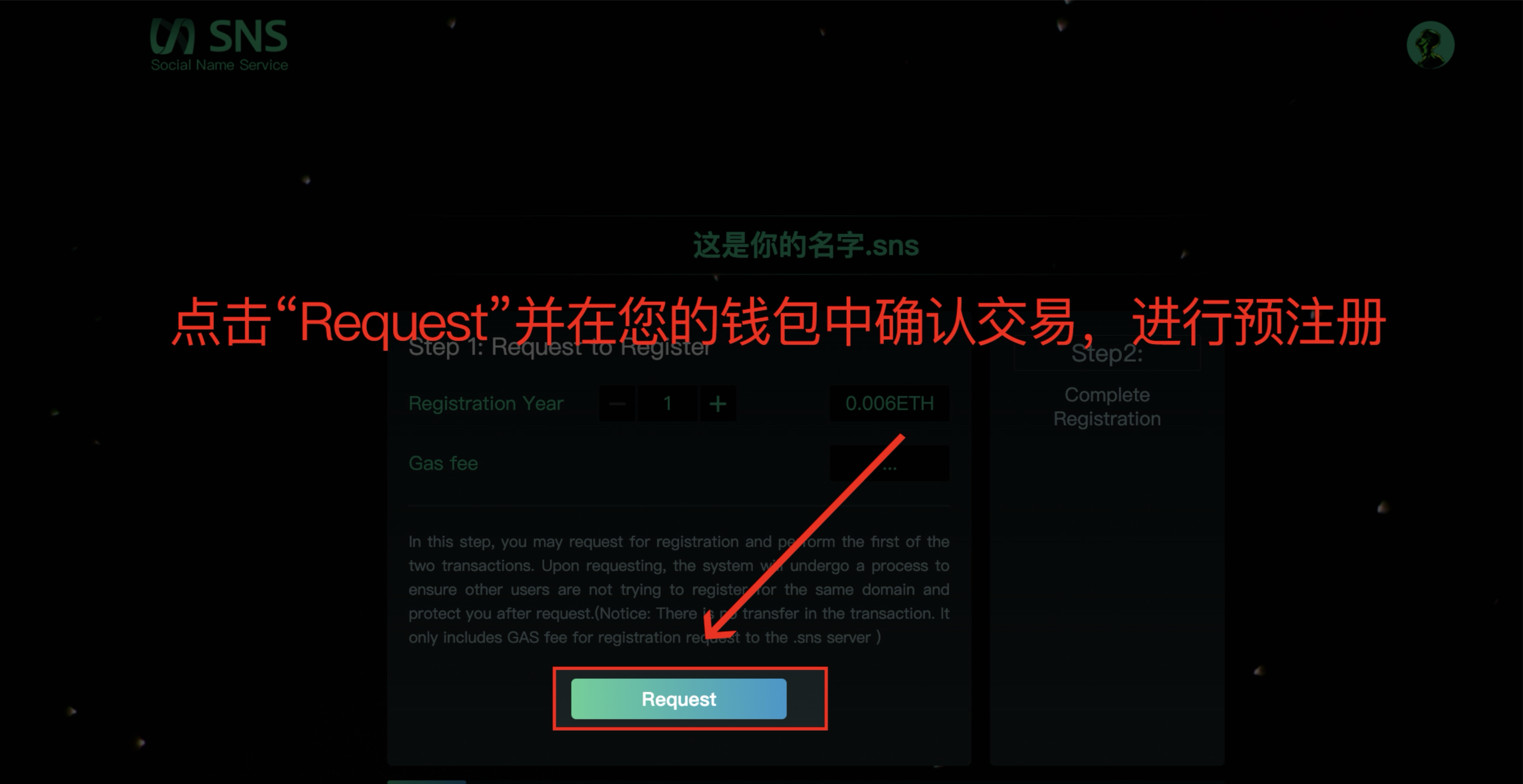 请注意!预注册是为了保护您即将注册的域名不被机器人抢先注册,但并不意味着为您保留该.sns域名