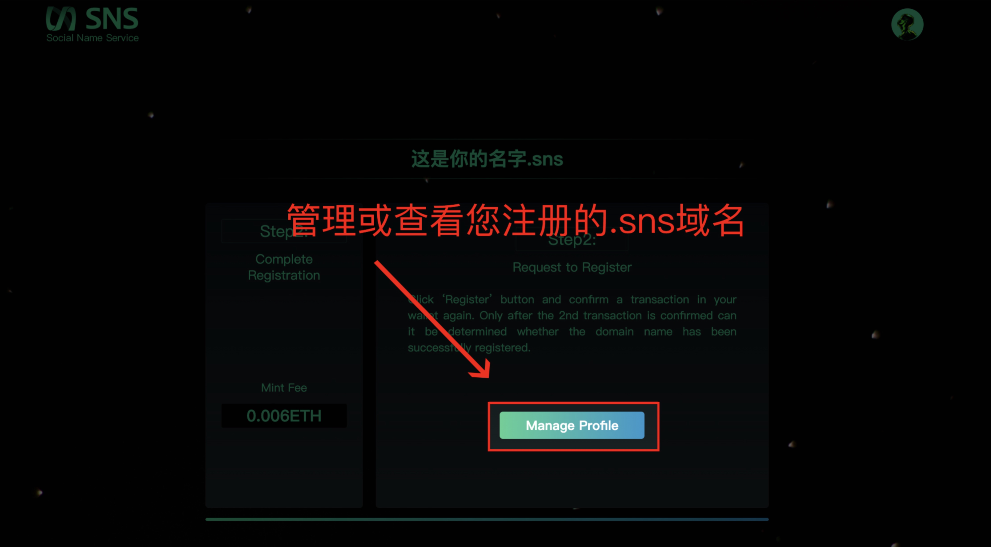 6. 完成注册:当您在钱包中完成支付后,恭喜您,您的.sns注册成功!您也可点击“Manage Profile”查看或管理您注册的.sns域名。