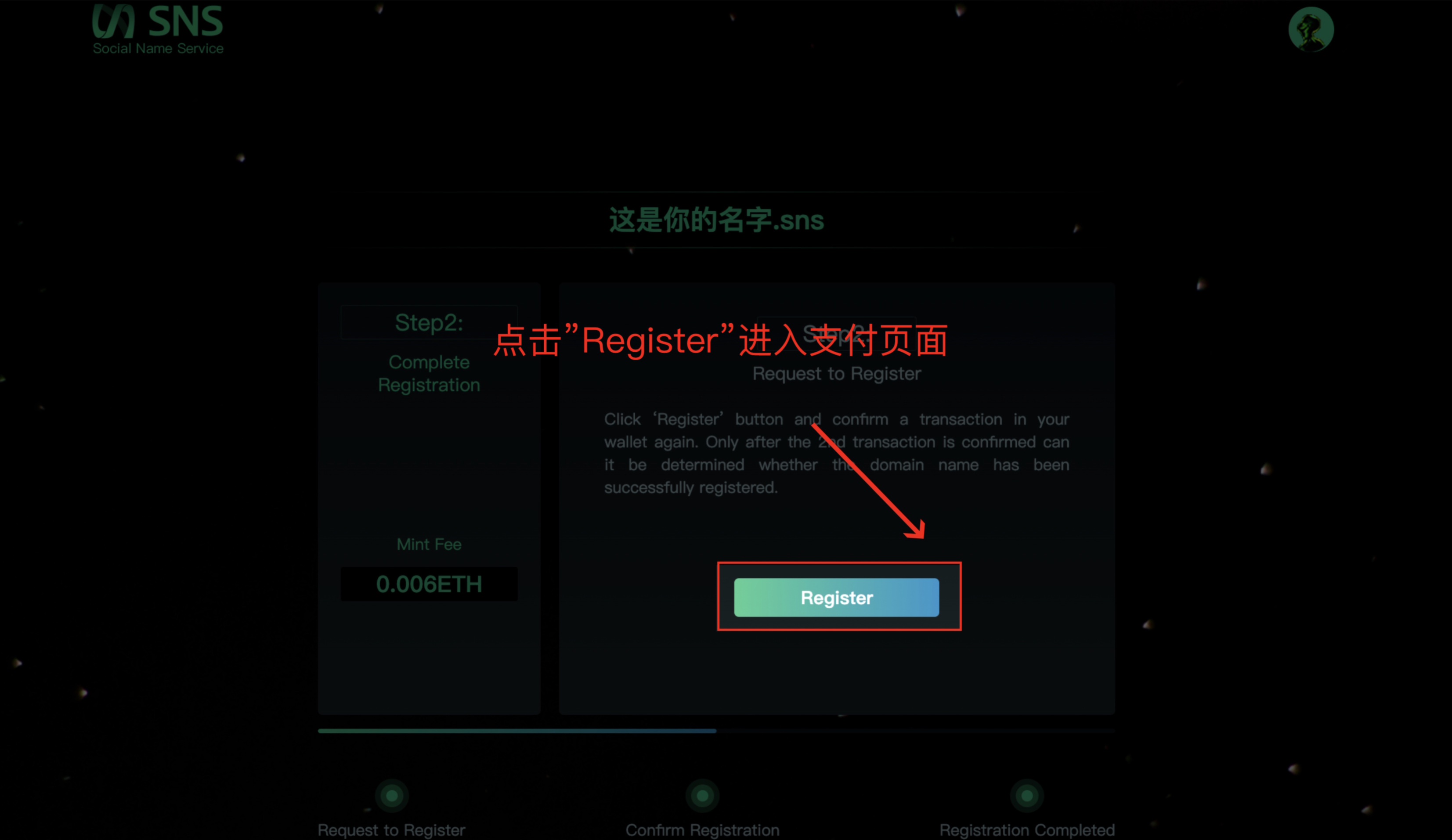 a. 如显示“Available”,代表当前.sns域名可以注册,点击“Register”进入注册页面