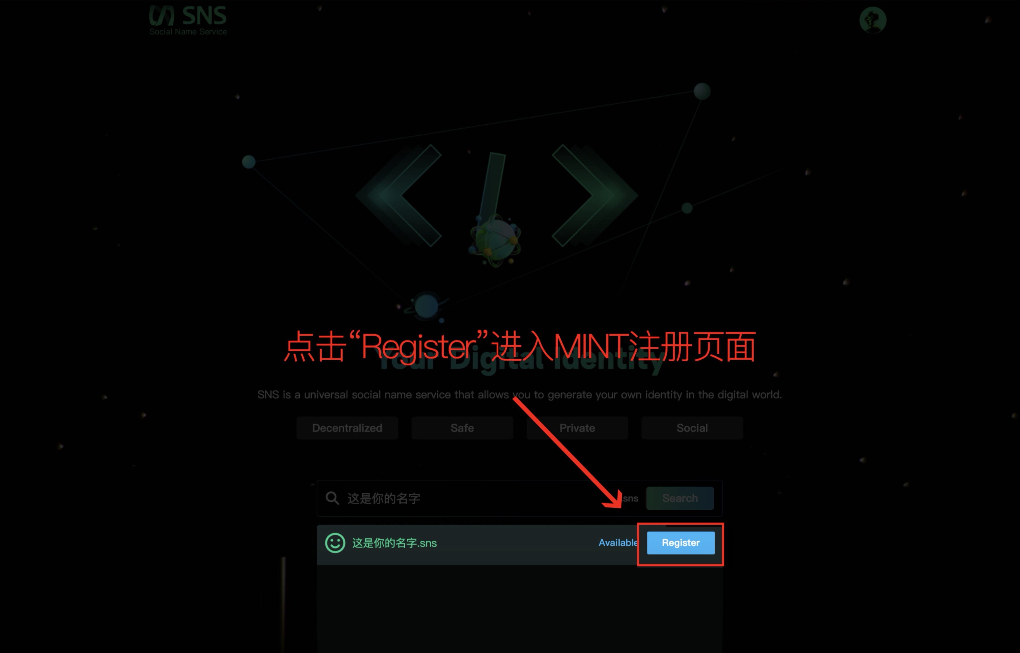 b. 如出现其他任何提示,代表当前.sns域名无法注册,需重新选择新.sns域名,直至显示“Available”,再点击“Register”进入MINT注册页面
